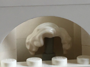 Another element I'm very proud of is the archway (waits a moment while everyone scrolls up to see the archway again). I've never gotten too fancy with doorways, nor have I ever found a use for that egg carton piece (the piece with two holes depicted below) that holds up the doorway, so I'm very happy with that, as well as the kinda-technical pieces holding up the wall behind the wig sign.